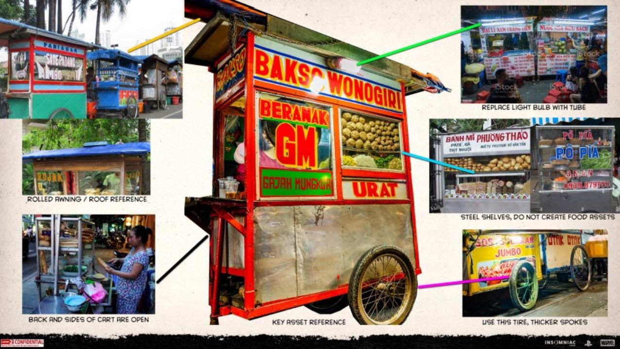 Berita baiknya? Untuk memastikan setting yang terasa otentik untuk lokasi Madripoor ini, terutama karena budaya Asia Tenggara-nya yang kental, Insomniac Games benar-benar serius mengerjakan sisi presentasi visual yang akan dihadirkan si dunia. Hal tersebut tercermin dari slide presentasi desainnya yang ikut bocor, dimana Anda bisa melihat objek dan lokasi mana saja yang mereka jadikan sebagai referensi aset. Di salah satu slide, Anda bisa melihat gerobak-gerobak kaki lima khas Indonesia dijadikan sebagai referensi, dari gerobak Bakso Wonogiri hingga Sate Padang. Beberapa catatan yang tertulis di sana adalah soal bentuk atap dan bagaimana ia terbuka di kedua sisi.