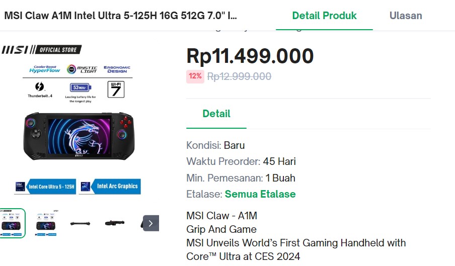 Diperkenalkan secara resmi di CES 2024 kemarin, MSI Claw yang akan menjadikan Intel sebagai otak utama untuk kekuatan utama pemrosesan video game-nya ini dipastikan akan masuk ke pasar Indonesia secara resmi. Walaupun tanggal rilis pasti belum ditentukan, namun salah satu halaman e-commerce MSI Official sudah menetapkan harga sekitar 11,5 juta Rupiah untuk proses pre-order MSI Claw A1M ini. Di halaman yang sama juga tertera harga yang tercoret di angka 13 juta Rupiah, yang sepertinya akan menjadi harga standar setelah proses pre-order selesai nantinya.