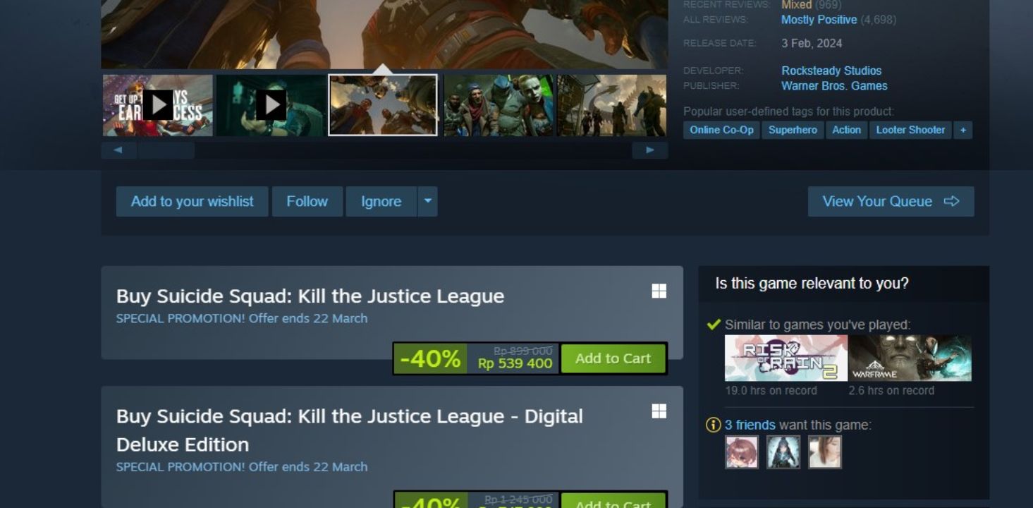Pernahkah Anda melihat kasus dimana sebuah video game yang sudah berusia uzur sekalipun, secara menakjubkan, berhasil mempertahankan harga jual mereka di pasaran. Situasi ini biasanya hanya mengitari game yang berhasil mencapai popularitas dan kesuksesan tinggi, yang bahkan membuat mereka “aman” dari masa diskon besar-besaran seperti Steam Sales misalnya. Sementara di sisi lain, game baru rilis yang cepat mendapatkan potongan harga sering diasosiasikan sebagai aksi panik sang developer atau publisher untuk menutup kegagalan rilis yang terjadi. Untuk urusan terakhir ini, situasi inilah yang sepertinya mengitari game live-service racikan Rocksteady dan WB Games – Suicide Squad: Kill the Justice League.